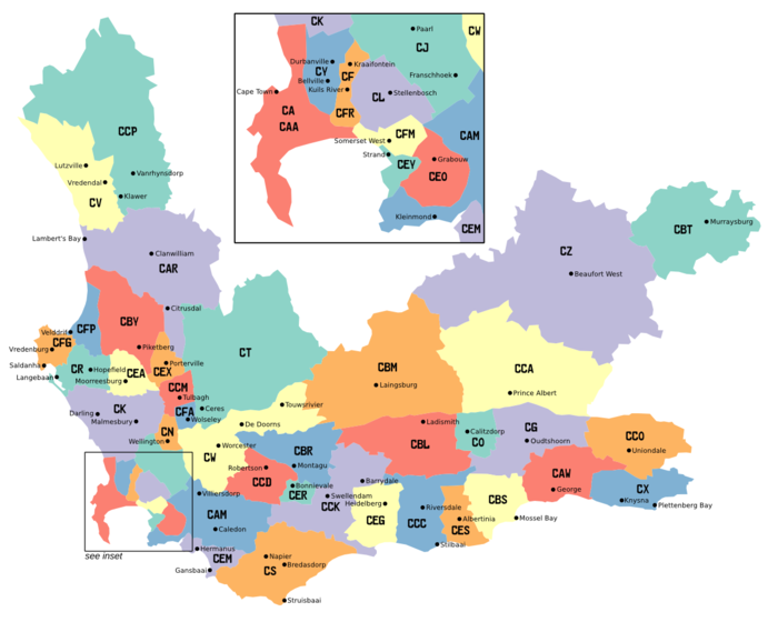 In the Cape, the prefixes were mostly assigned in order of the size of the municipality. Cape Town got CA, as it is the largest city in Cape Province, and Port Elizabeth got CB. Some smaller towns were given three-letter prefixes. The way our cars are licensed changes from time to time. The Western Cape system is poised to change again soon, but on this page, you can find where the cars with these licence plates come from. If you click on the name, the site will take you to the page where there is a short history and information about each place